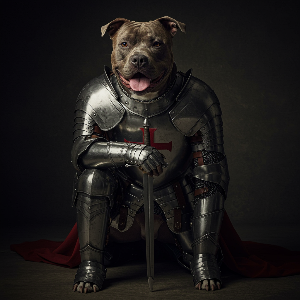 Portrait of a noble pitbull knight in a kneeling pose, showcasing ornate armor with exquisite detailing, a harmonious blend of silver and silk accents. Captured in dramatic, cinematic lighting, the scene is rendered in high-resolution, evoking a sense of regality and strength. The intricate designs on the armor reveal both artistry and function, emphasizing the loyal and valiant spirit of the knight.