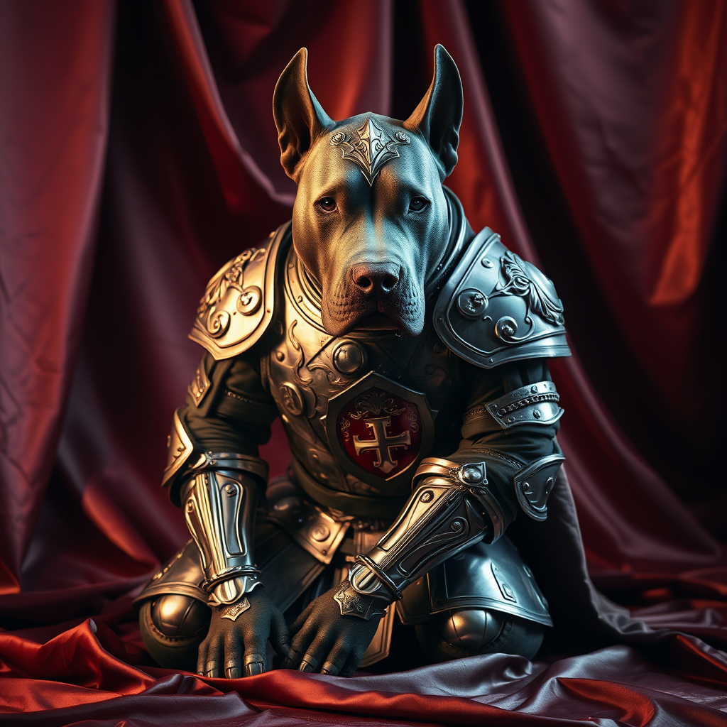 Portrait of a noble pitbull knight, kneeling with grace, adorned in finely detailed armor featuring intricate silver designs. The armor gleams against the rich backdrop of luxurious silk, the atmosphere brought to life through cinematic lighting. Captured in stunning 4k resolution, the scene emphasizes the loyal and powerful presence of the pitbull knight in an elegantly elongated composition.