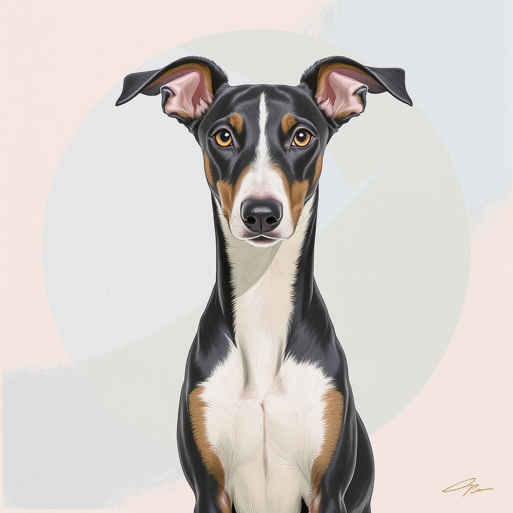 Portrait of a Portuguese Podenco dog, capturing its graceful stance and alert expression, centered symmetrically, exuding a calm and vibrant vibe. The illustration features sleek lines and smooth curves, crafted in Adobe Illustrator, with an aesthetic touch. Set against a soothing and harmonious two-tone pastel background, the composition has subtle creative embellishments, enhancing the dog's noble and lively character.