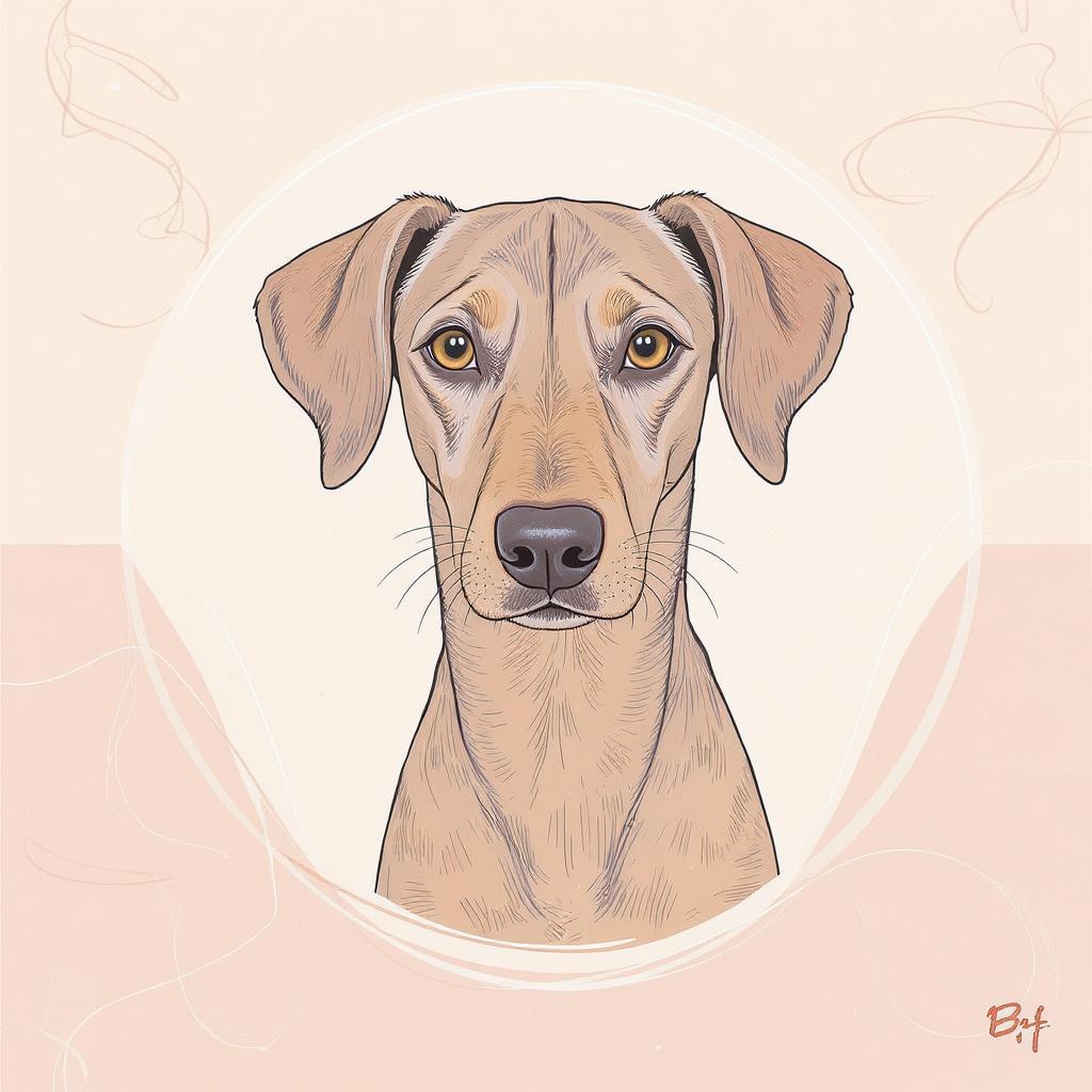 Portrait of a Portuguese Podenco dog, symmetrical and exuding a relaxed vibe, illustration style with Adobe Illustrator precision, featuring an aesthetically pleasing two-tone pastel background, incorporating gentle, swirling patterns and subtle hints of texture to enhance the overall composition.