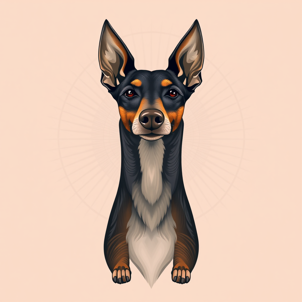 Portrait of a Portuguese Podenco Dog, symmetrical stance, radiating tranquility, digital illustration style, crafted with Adobe Illustrator, harmonious and aesthetic, set against a two-tone pastel gradient background. The dog's eyes convey a sense of wisdom, with intricate detailing in the fur texture, and subtle geometric patterns integrated into the design, adding depth and visual interest.