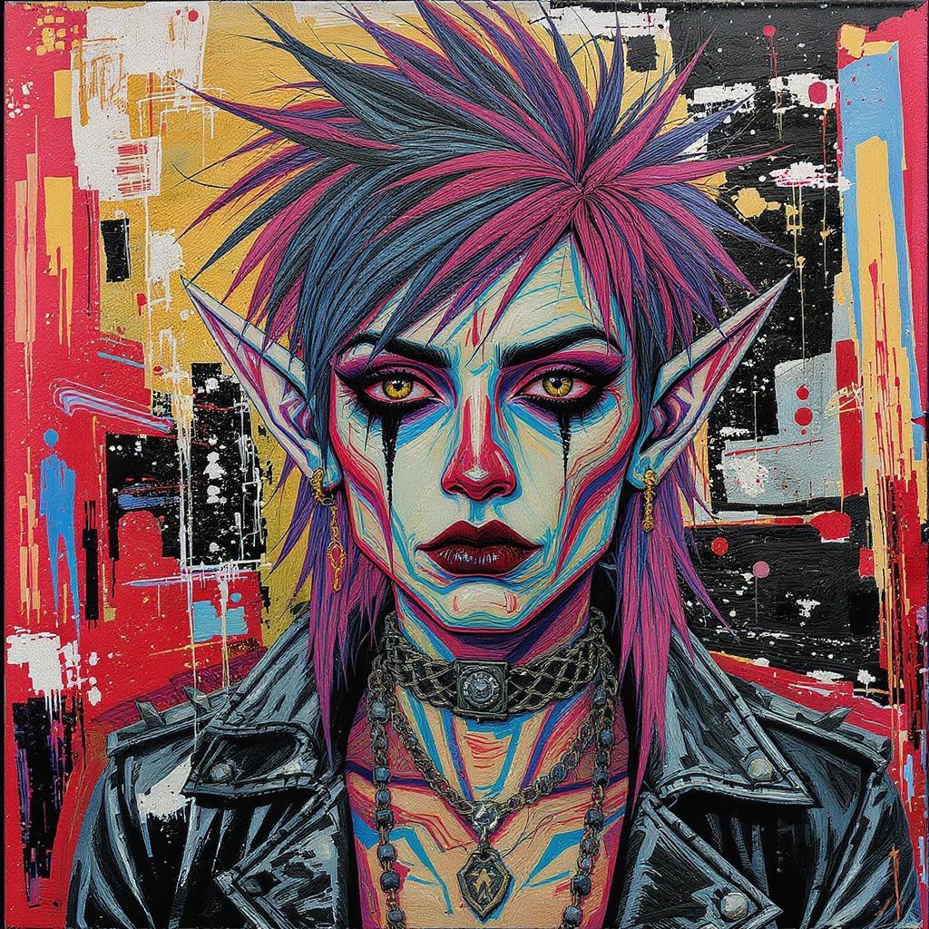 Portrait of a punk elf, intricately detailed, in a neo-expressionist style inspired by Julian Schnabel and Diego Rivera; vivid colors and bold textures, elfin features with edgy punk elements, set against a dynamic and abstract background, capturing a rebellious yet mystical aura, painted on canvas.