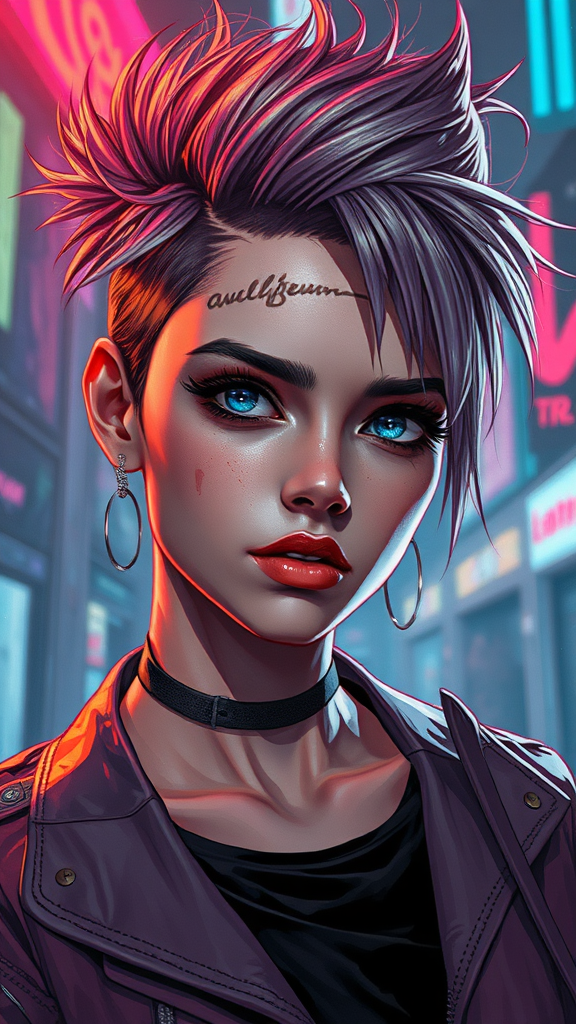 portrait of a punk girl with standing hair, featuring a sheen with holographic elements, set in a futuristic sci-fi cyberpunk scene. Inspired by synthwave aesthetics and reminiscent of a bladerunner movie setting. Artists ismail inceoglu, dragan bibin, hans thoma, greg rutkowski, alexandros pyromallis, nekro, and rene magritte converge to create a detailed illustration. The girl has a perfect face with fine details, realistic shading, and a sharp chin. The image is crisp and detailed, avoiding any imperfections such as poor quality, errors, mutations, or disfigurement. The girl is captured with anatomical accuracy and balanced proportions, with attention given to hands and facial features. The scene evokes the unique style and atmosphere of the cyberpunk genre, with innovative and creative twists.
