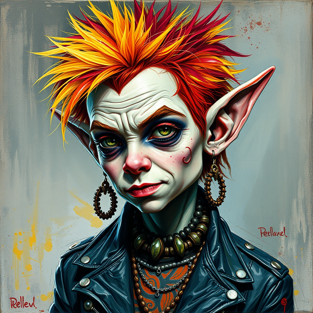 Portrait of a rebellious elf with vibrant, spiky hair, adorned with eclectic jewelry and a distinctive leather jacket, captured in a highly detailed, neo-expressionist style using rich oil textures, with dynamic brushstrokes and bold colors reflecting the elf's spirited and unconventional nature.