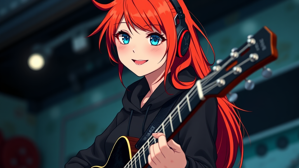 Portrait of a red-haired girl with long hair styled to one side, smiling flirtatiously at the camera. She stands in a dynamic angle, dressed in a black hoodie and pants, sporting striking blue eyes and bold red lips with a hint of Asian features. She's wearing headphones and holding a guitar with a plectrum ready to play, captured in a hyper-detailed, high-contrast style. The image has a soft blur with dramatic lighting to highlight intricate details, resembling a vibrant and playful anime character, making for a captivating full-body cowboy shot.