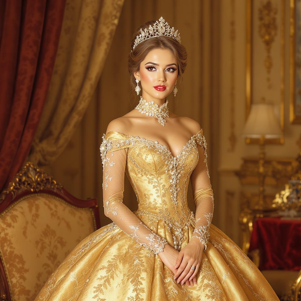 Portrait of a regal princess in a golden gown, with intricate detailing, captured in 32-megapixel, ultra-high definition, using a 90-mm lens, in sharp focus, settings at f:9, ISO 120, shutter speed 1:100, with a soft backlight, award-winning quality, featuring subtle catchlight, exceptional sharpness, perfect facial symmetry, in 10k resolution with an aspect ratio of 18:32.