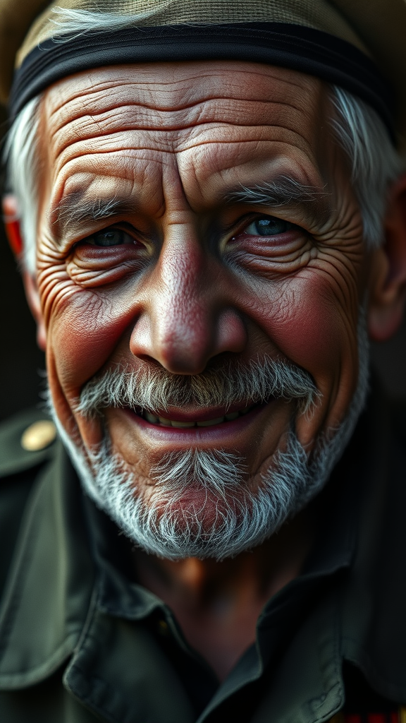 Portrait of a resilient 85-year-old decorated general, with a weathered face that tells stories of courage and leadership, clean-shaven and wearing a gentle, wise smile. The image captures him in a stoic and cinematic manner, showcasing epic details in 4k resolution. Shot on Kodak film, it emphasizes a richly detailed and dramatic mood with striking contrasts, highlighting the depth of his character and the strength of his presence.
