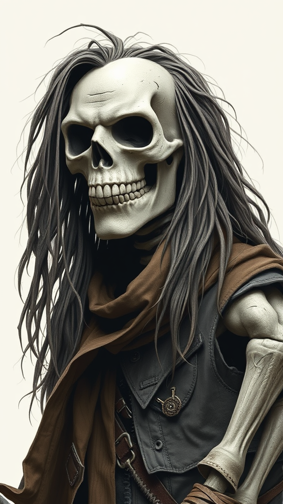 Portrait of a Rock Legend: a skeletal figure with a face lined like carved stone, adorned in rugged leather attire, and cascading, flowing locks.