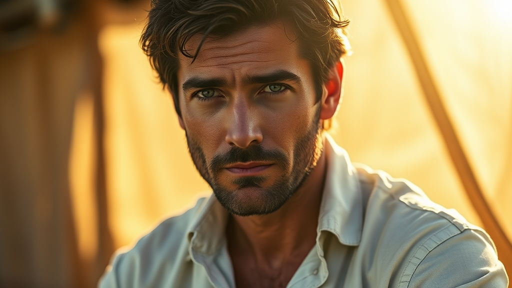 Portrait of a rugged Pedro Pascal, inspired by his role in The Last of Us, wearing an unbuttoned linen white summer shirt, under warm natural light, captured with the clarity of a Hasselblad H4D 200MS Digital Camera and a Mitakon Speedmaster 85mm f/1.4 lens, framed within a dreamy and cinematic aspect ratio, evoking a sense of depth and storytelling in his gaze.