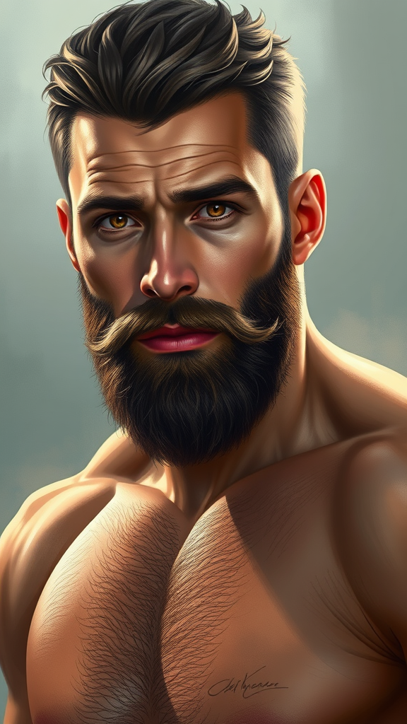 Portrait of a rugged yet refined man showcasing a well-groomed beard and captivating hazel eyes, handsome and statuesque with a muscular build rendered in intricate detail. Illuminated by a soft, ethereal glow, the digital painting presents a harmonious blend of elegance and strength. Crafted with smooth and precise strokes, capturing a sharp focus that highlights the depth and allure of his features. A seamless blend of high-concept art reminiscent of renowned artists WLOP, Mars Ravelo, and Greg Rutkowski, bringing forth a fusion of classic portraiture and modern artistry, elegantly detailed in a vibrant composition.