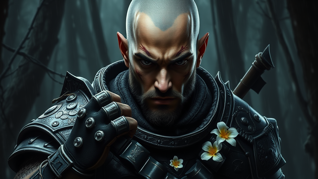 Portrait of a rugged young ranger man with a piercing gaze, clad in intricate armor, bald and exhibiting an air of anger, in a grim, shadowy forest setting. The scene possesses sharp, highly detailed elements, reminiscent of concept art. The ranger's pose is dynamic, with a focus on realistic hand depiction. The environment is fantastical and cluttered, rendered in 8k unity, capturing an action moment. The lighting is dark with heavy shadows, enhancing the detailed features of his face. Inspired by the art styles of Artgerm, WLOP, Ilya Kuvshinov, Greg Rutkowski, and Alphonse Mucha, the digital painting uses octane rendering techniques. The atmosphere is accentuated with heavy rain and floating particles, bathed in dim and two-tone lighting. A subtle flower adorns the scene, along with facial markings. The ranger's attire includes blue jeans, and the artwork is enriched with 3D rendering, creating a smooth, sharp-focused illustration. The setting creates a monochrome, slightly blurred haze, evoking a sense of mystery and intensity.