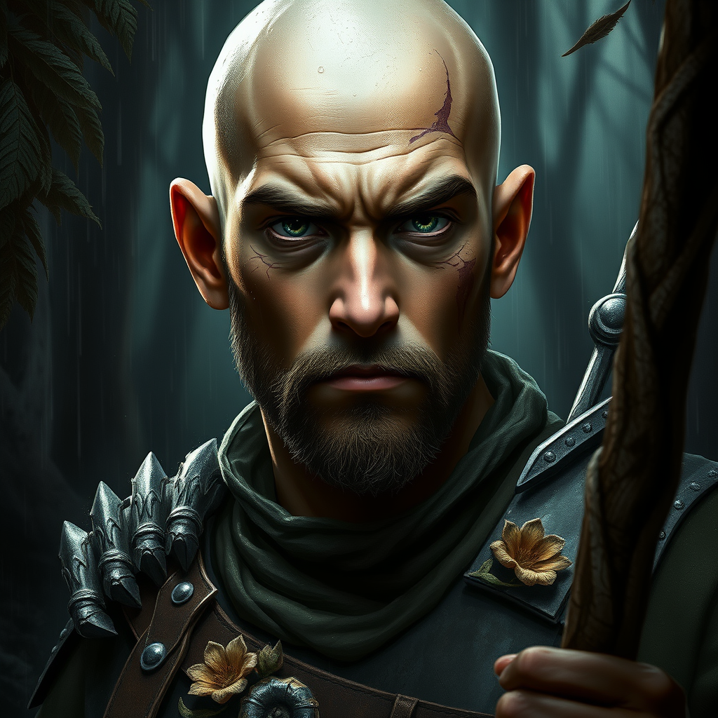 Portrait of a rugged young ranger with a piercing gaze, clad in weathered armor, his expression stern and determined. The scene is set in a dense, shadowed forest, rich with dark tones, exuding an air of mystery. His bald head and grizzled appearance convey a life of hardship and resilience. The composition captures a full-body action shot, with dynamic posturing that suggests readiness and agility. Rendered in exquisite detail, every pore and feature is sharply defined, reminiscent of high-quality digital art seen on platforms like ArtStation. This piece draws inspiration from masters such as Artgerm, WLOP, Ilya Kuvshinov, Greg Rutkowski, and Alphonse Mucha. The setting is a fantastical, majestic environment cluttered with natural elements, painted with a touch of decadence. The atmosphere is heavy with rain, tiny droplets suspended in the dim light, and dramatic two-toned illumination accentuates the figure's form. Subtle flower motifs and facial markings add a layer of intrigue. This illustration embodies smooth, sharp focus typical of concept art, yet eschews common pitfalls like asymmetry and disproportions, maintaining clarity and coherence without extraneous visual distractions. Every element, from realistic hands to the ambient haze, is rendered with an artist's precision, free from digital artifacts, ensuring an immersive, high-quality experience.