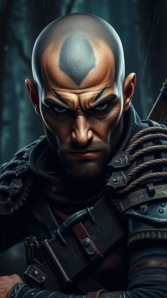 Portrait of a rugged young ranger with a piercing gaze, clad in weathered armor, bald, grizzled features, exuding an aura of anger and determination. The scene is draped in dark colors, set against a dense forest backdrop, emphasizing a sharp and highly detailed visual style. The figure strikes a dynamic pose within a cluttered, majestic environment, captured in a full-body 8k unity render. The atmosphere is charged with action, showcasing intricate details like skin pores and a heavily shadowed face. The dim lighting is accentuated by floating particles in the midst of heavy rain, casting an ethereal glow. Facial markings add character, juxtaposed with elements of nature. The artwork is inspired by the styles of Artgerm, wlop, Ilya Kuvshinov, Greg Rutkowski, and Alphonse Mucha. Despite the heavy shadows, the focus remains sharp, delivering a highly realistic digital illustration infused with a sense of motion and intensity. The setting is enhanced by subtle two-tone lighting and the inclusion of small creative touches.