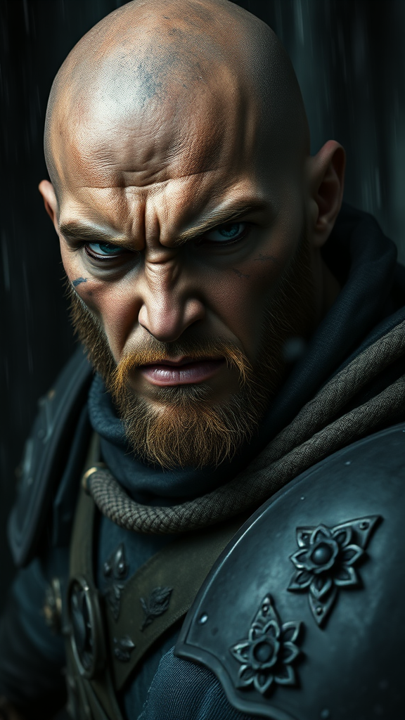 Portrait of a rugged young ranger with a piercing gaze, wearing intricate armor. His grizzled, bald head exudes an aura of anger and determination. The atmosphere is grim, dominated by dark colors, set against a mysterious forest backdrop. The composition is sharp and highly detailed, showcasing a dynamic pose and striking environment, captured in a majestic, cluttered setting. Rendered in full body 8k, this action shot features detailed skin pores under very dark lighting and heavy shadows. The face is richly detailed and decadent, reflecting digital artistry inspired by Artgerm, WLOP, Ilya Kuvshinov, and Greg Rutkowski. Elements of Alphonse Mucha's style are echoed in the fantastic location, coupled with heavy rain and floating particles that enhance the dimly lit scene. Trim and two-tone lighting add depth, while a subtle flower accent and facial marking contribute to the character's mysterious aura. He is clad in rugged blue jeans, a juxtaposition to the intricate armor, grounded in a 3D render style. The scene is infused with a blur of monochrome tones, amid a haze that softens the sharp focus of this digital painting.