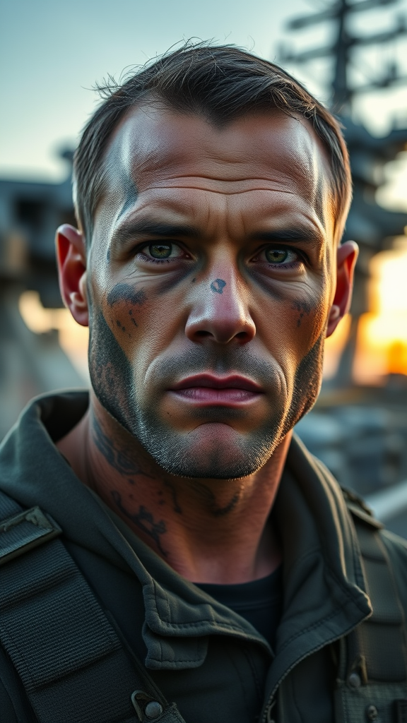 Portrait of a ruggedly handsome navy seal with striking green eyes, his face marked by scars and streaked with tactical face paint. He wears the iconic navy seal uniform, set against the backdrop of an aircraft carrier. The scene is captured with a 50mm lens, the natural lighting emphasizing his intense gaze and the texture of his uniform. Adjustments to composition reveal subtle reflections in his eyes and hints of a sunset in the background sky, shot at F1.2, enhancing the depth and detail of his formidable presence.