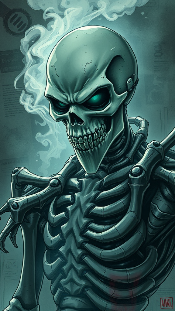 Portrait of a ruthless supervillain in a skeletal mask, exuding a brutal techno vibe with light colors and smoke, drawn in an anime-inspired comic style. The digital painting features an 8k resolution with muted colors, creating an epic composition rich in drama and intricate details. The character is surrounded by an atmosphere that reflects their dark and morbid nature, with visual elements suggesting mutation and deformation. The anatomy is intentionally flawed with exaggerated and disfigured proportions, such as extra limbs, long neck, and malformed features, contributing to their terrifying presence. The background is cluttered with elements like a distorted camera, illegible text, and indistinct signatures or watermarks, enhancing the chaotic aesthetic of the piece.