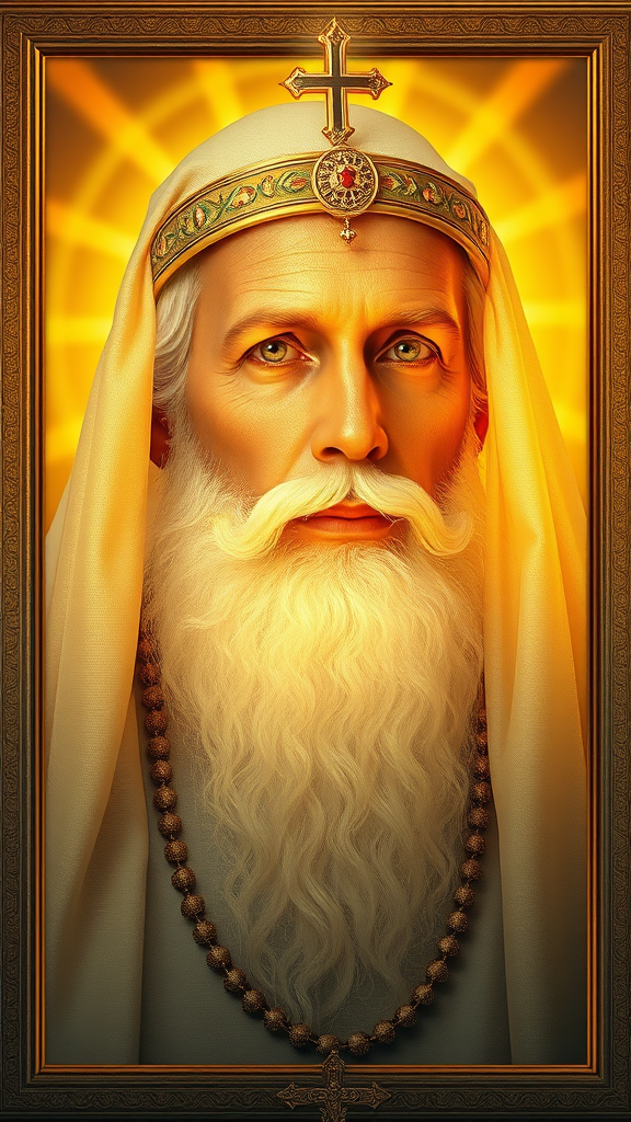 Portrait of a sacred priest bathed in holy light, showcasing ultra quality and stunning visuals with intricate details and ideal anatomy. The scene exudes a magical and divine ambiance, highlighting a beautiful face amidst golden hues. The canvas frame elegantly encases a 3D depiction of an ethereal presence, featuring slightly surreal colors. The composition maintains a dreamlike quality, with subtle artistic choices that enhance the mystical feel. A hint of otherworldliness is reflected through minor anomalies, lending an air of intrigue and depth. The overall impression is one of celestial beauty, where every feature is thoughtfully rendered to merge artistic creativity with a sacred vision.