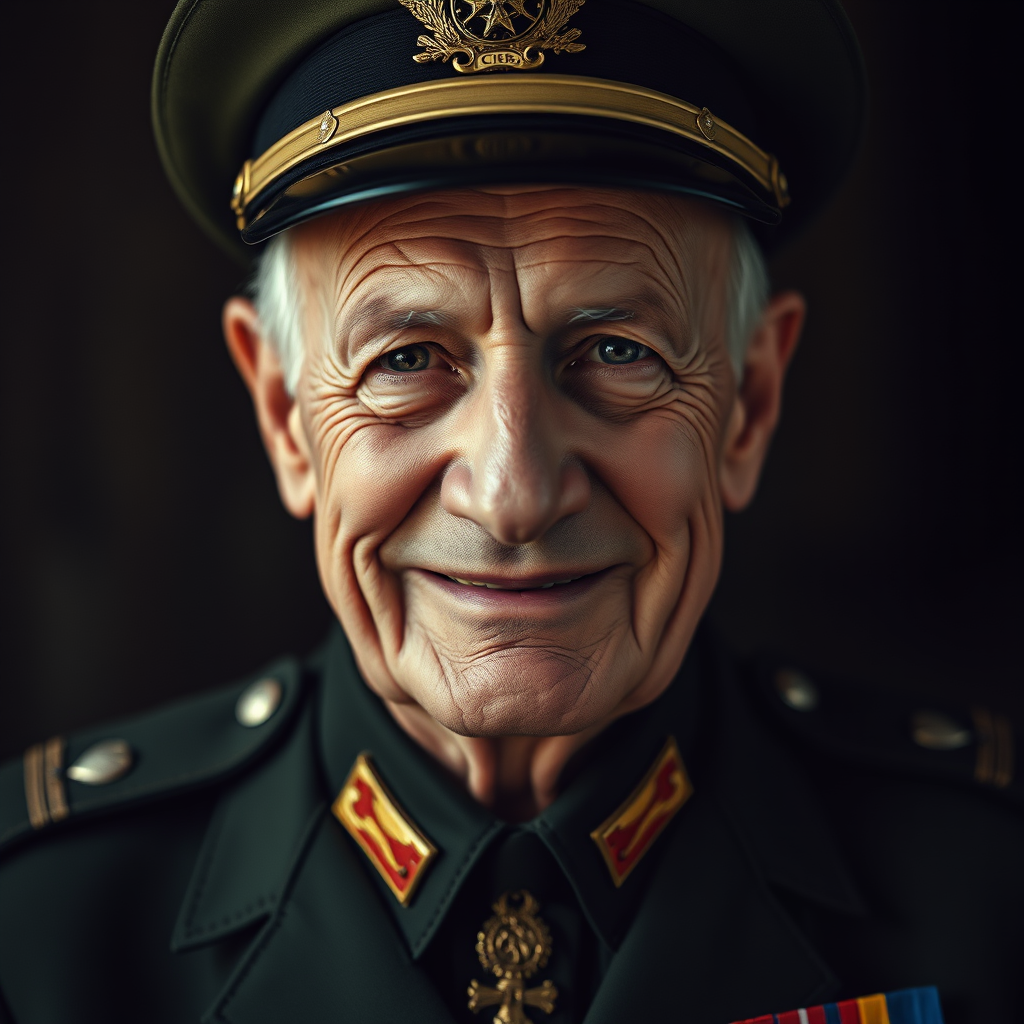 Portrait of a seasoned 85-year-old decorated general, clean-shaven with piercing eyes, offering a gentle and warm smile, embodying a true stoic presence in a cinematic fashion. The scene captures his deeply lined face, testament to a lifetime of service, against a dark and moody backdrop. Shot in 4k with exquisite detail on Kodak film, the image radiates an epic essence, highlighting the intricate textures of his uniform and the gleaming medals that reflect a storied past.