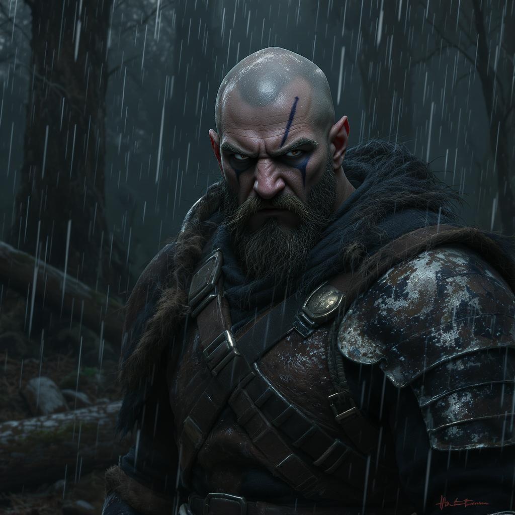 Portrait of a seasoned ranger with a piercing gaze, donning armor and rugged attire. He stands bald and formidable, exuding an aura of anger and determination. Set against a dark, densely wooded backdrop, his presence is both commanding and enigmatic. The scene is rich in detail, capturing the texture of his skin and the intricacies of his gear in an 8k unity render. Heavy rain pours down, creating a mystical atmosphere with particles dancing in dim light. His face bears distinctive markings, hinting at stories untold. Dynamic lighting accentuates his fierce, gritty demeanor, creating stark contrasts and accentuating the shadows. The environment is cluttered with natural elements, offering a majestic and immersive setting. This is an artful blend of realism and fantasy, invoking the styles of famed artists like Artgerm, WLOP, Ilya Kuvshinov, Greg Rutkowski, and Alphonse Mucha, resulting in a captivating digital painting with flawless anatomy and intricate detail.