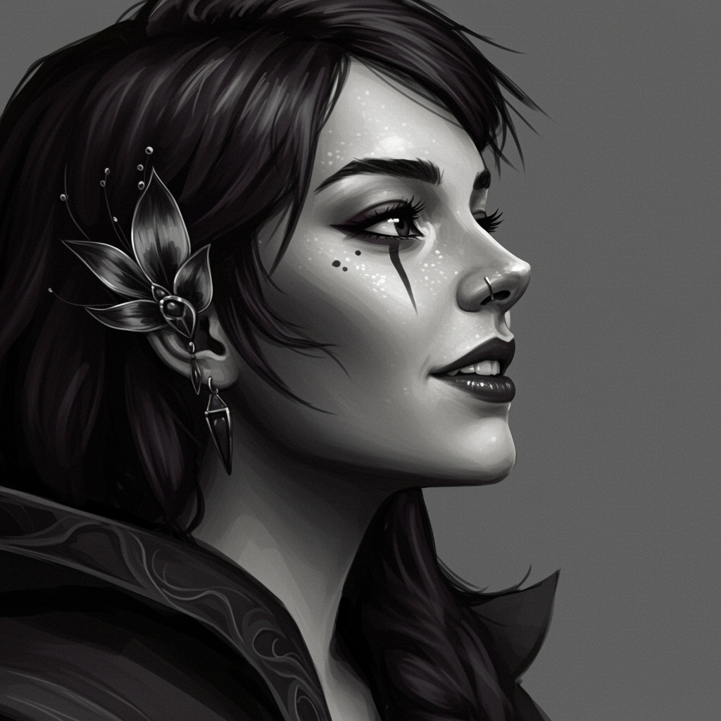 portrait of a single girl with a realistic appearance, grey background, subtle facial mark, parted lips revealing teeth, slightly turned nose, light smile, looking off to the side, inspired by dota 2's dark willow character, emphasis on monochrome with muted spot color elements, earring and jewelry details, a decorative flower accent, lips highlighted in profile from a side view
