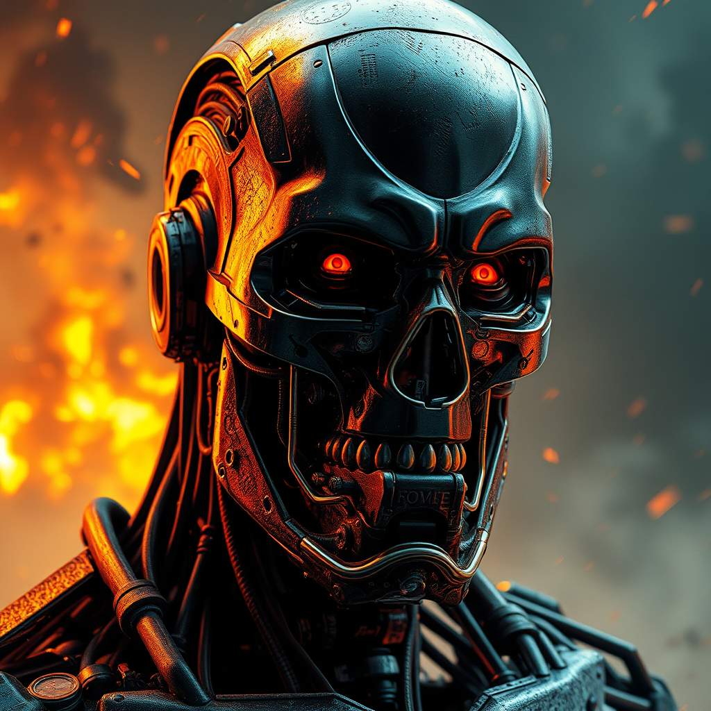 Portrait of a sinister, hyper-realistic cyborg resembling the Terminator, showcasing intricate and hidden details amidst a dynamic background. The scene captures the aura of menace, highlighting highly detailed mechanical features and life-like textures. The composition is presented in high dynamic range, with an emphasis on realism and meticulous attention to every element, maintaining an elongated vertical aspect ratio for dramatic effect. Subtle creative enhancements emphasize the futuristic technology and underlying malevolence of the cyborg, presenting a mesmerizing yet chilling vision.