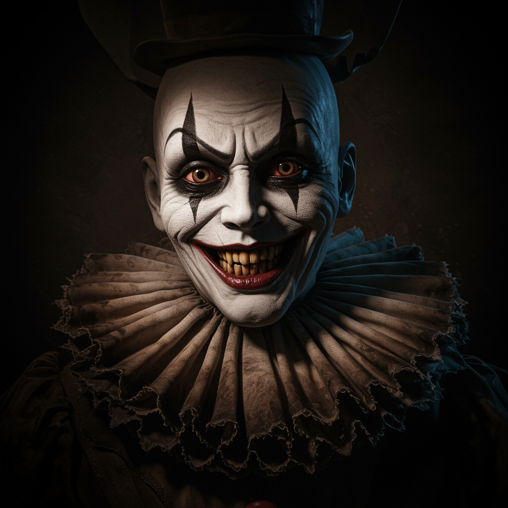 Portrait of a sinister pierrot, ominous, dark, chiaroscuro, highly detailed, intricately designed, lifelike, authentic. Features an unsettling, menacing grin with sharp eyes that pierce through the shadows, elaborate makeup that accentuates its malevolent expression, wearing a tattered, vintage ruffled collar that whispers of forgotten performances, the lighting casting dramatic shadows to heighten the eerie atmosphere in a hauntingly realistic setting.