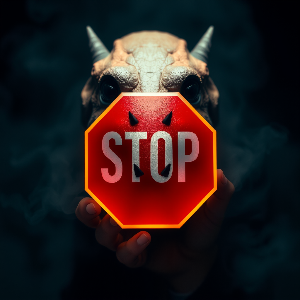 Portrait of a stop creature, front-facing with intense focus, enveloped in an eerie volumetric mist; an embodiment of departure and caution, exuding a sense of retreat and return. The creature's features are meticulously detailed, exemplifying symmetrical balance. Its presence commands a pause, a warning to halt and consider.illuminated with a sharp clarity that contrasts with the surrounding haze.