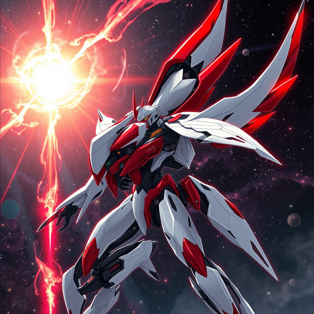 Portrait of a streamlined Sci-fi mech in a futuristic fighting stance, featuring a slender glossy white and red design with intricate insectoid elements. This highly detailed mech is equipped with Sci-fi wings, embodying a fusion of Tsutomu Nihei and Akira artistic styles. The backdrop features the dramatic expanse of outer space, highlighted by a luminous quasar and the captivating cosmos of stars. Powerful plasma beams and a dynamic plasma blast wave add intensity, all rendered in stunning 8k ultra-high-definition graphics. The scene captures a blend of anime art and hyper-realistic three-dimensional graphics, with complex lighting and a bright flash for an awe-inspiring visual impact.