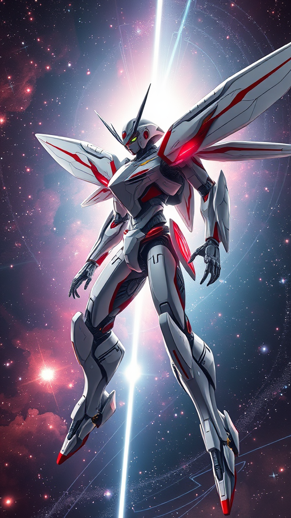 Portrait of a streamlined Sci-fi mech with a slender figure in a dynamic fighting stance, featuring glossy white and red details, intricately designed with insectoid elements reflecting a Tsutomu Nihei and Akira inspired style. Set against the backdrop of a vibrant quasar in deep space, the mech is equipped with sci-fi wings and appears amidst a dramatic cosmic scene filled with stars and quasars. The environment is alive with powerful beams and plasma blast waves, capturing the essence of an anime art form with intense three-dimensional graphics and complex lighting. The hyper-realistic depiction in 8K UHD showcases a bright flash illuminating the cosmos, blending manga drawing aesthetics with sophisticated imagery.
