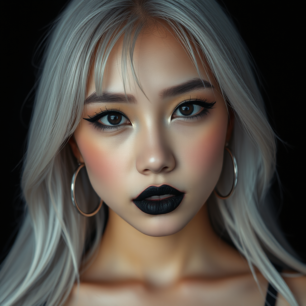 Portrait of a striking young goth girl with an air of mystery, wearing deep black lipstick and bold black eyeliner. Her hair is a stunning silver-white, complementing her big round silver earrings that glint subtly against the black backdrop. Her skin gleams softly with a hint of natural luminosity. The film grain effect adds a timeless quality to the high-resolution studio shot taken with a Nikon D850. Her Asian, Chinese features are accentuated by the dramatic makeup, creating a captivating contrast with her ethereal hair. A touch of gentle blue highlights in her hair creates an unexpected, yet harmonious twist to the overall monochromatic theme.
