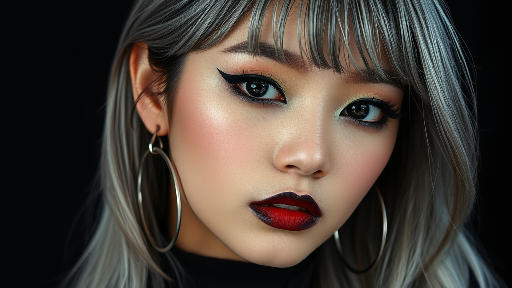 Portrait of a striking young goth girl with deep black lipstick and smoky black eyeliner, her hair a shimmering blend of silver and white. She wears bold, circular silver earrings that catch the light, adding a touch of elegance. The image has a subtle film grain effect, enhancing its cinematic quality. The studio shoot is set against a matte black backdrop, highlighting her striking features. Captured with a Nikon D850, the photograph features an Asian, Chinese model exuding both mystery and allure.