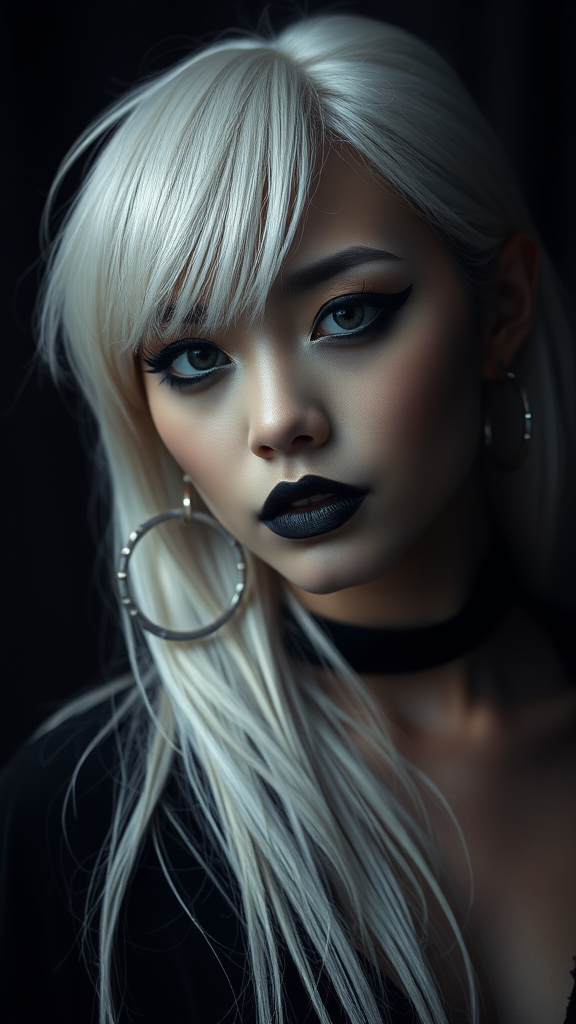 Portrait of a striking young goth woman with deep black lipstick and bold black eyeliner, her long silver-white hair contrasting elegantly against a dark studio backdrop. She wears large round silver earrings that catch the light softly, adding a touch of luminescence to the scene. Her expression is enigmatic, capturing a blend of mystery and beauty. The image is captured in high quality with a subtle film grain effect, enhancing the allure. Shot using a Nikon D850, the atmosphere exudes a captivating aura. The model is of Asian descent, with distinct Chinese features adding to her unique presence.