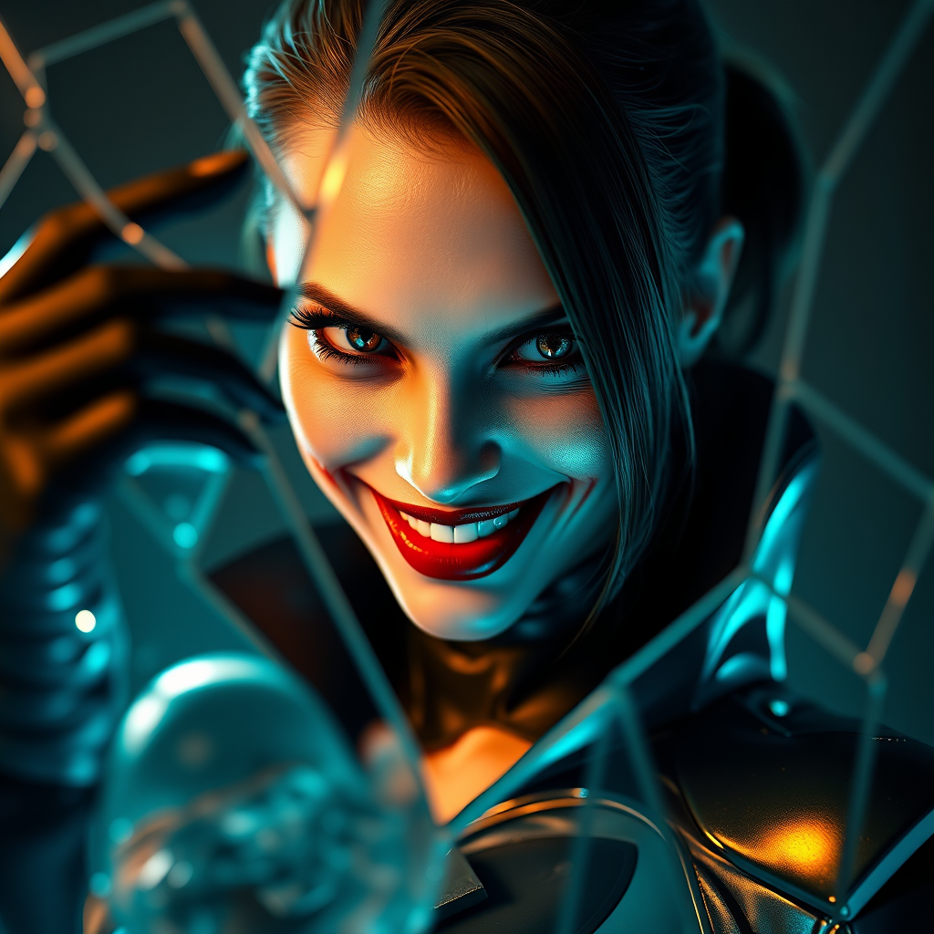 Portrait of a strikingly beautiful girl embodied as the Joker, wearing a sleek, modern women's Batman costume. Her expression hosts an evil grin, enhanced by the way she gazes into a fractured mirror, surrounded by an eerie atmosphere of horror and dread. Her alluring form is accentuated under professional lighting, capturing high detail and attention to every element. The scene resonates with a fashion-forward cyberpunk aesthetic and pearl-like illusion, crafted in a hyper-realistic style. 3D artistry shines through with C4D and Octane rendering, showcasing complex details in HD with animated lighting and the artful use of ray tracing, making the scene vividly lifelike and dynamic, akin to an avant-garde wallpaper.