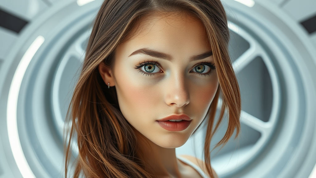 Portrait of a strikingly beautiful girl with a delicate and innocent expression; her slender figure framed by lustrous hair in a futuristic setting. She engages the viewer directly, posing elegantly in front of a sleek, sci-fi-inspired white laboratory. A cutting-edge reablation capsule looms in the background, contributing to the atmosphere of innovation. The image boasts stunning quality, with ultra-high resolution and photorealistic detail reminiscent of Rembrandt lighting. Every element is sharp and vibrant, avoiding imperfections like distortion, poor quality, or disfigured features, ensuring a harmonious and visually captivating portrayal. The scene radiates a clean, sophisticated aesthetic with natural light highlighting the subject’s features. Indulge in the futuristic window design, the ethereal play of light, and the soft, alluring expressions that evoke a sense of awe and curiosity.