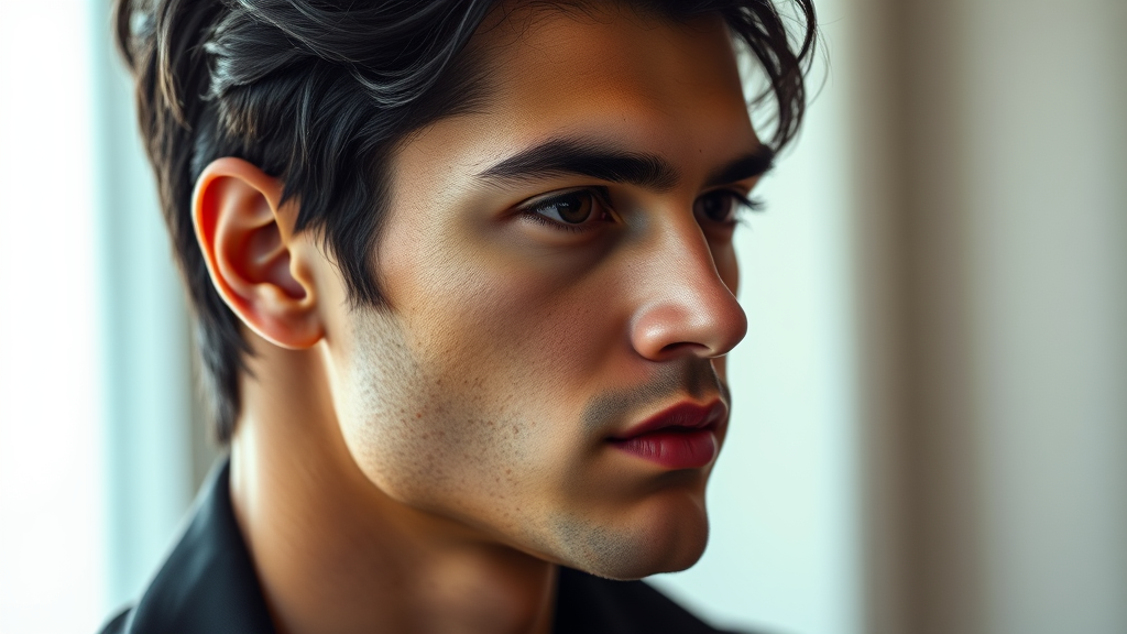 Portrait of a strikingly handsome man with dark black hair, captured in a dynamic composition. His features exude charm and the scene resonates with an artistic flair. The focus is on delivering a high-quality depiction, avoiding any elements of poor quality or distortions. The image showcases the man in a side view, ensuring clarity and elegance, with attention to detail that avoids exaggerations or awkward proportions. The result is a captivating and realistic portrayal, celebrating beauty and artistry in a refined and tasteful manner.