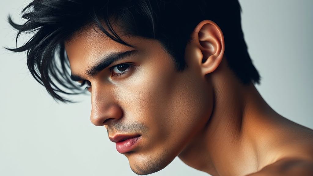 Portrait of a strikingly handsome man with jet-black hair in a dynamic composition. The focus remains on his captivating features, set against a simple background to avoid distractions. The image is sharp and high-quality, emphasizing the subject's unique allure. The side view accentuates his well-defined profile and strong jawline. The portrayal is realistic and finely detailed, with well-proportioned anatomy and a natural pose, ensuring all elements are harmoniously balanced. The scene is devoid of any artificial effects or added distractions, maintaining a pure and artistic representation without garish elements.