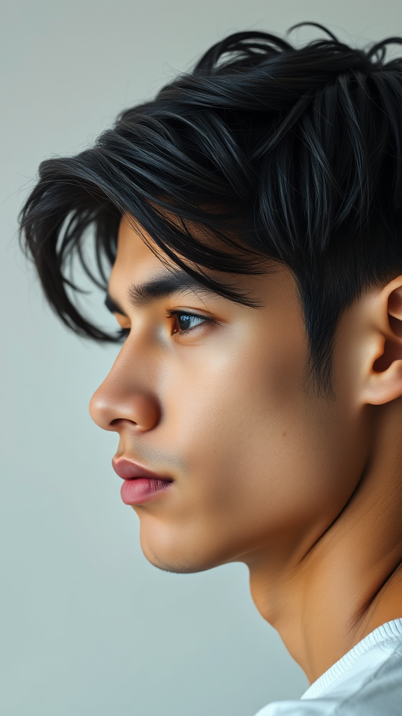 Portrait of a strikingly handsome young man with dark black hair, captured in a dynamic composition. The side view highlights his features against a soft background, avoiding any clutter or unnecessary elements. The image focuses on clarity and quality, ensuring every detail of the man's face is beautifully rendered, with a natural and realistic appearance. His expression is confident and serene, adding depth and personality. The overall composition is clean, crisp, and high-resolution, presenting a captivating piece of art that showcases elegance and simplicity.