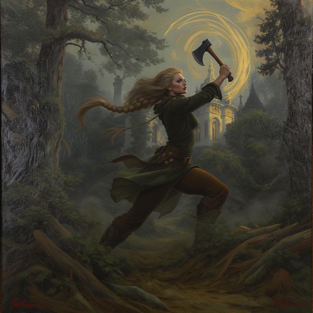 Portrait of a strong lumberjack woman with a magnificent, flowing braid, clad in a form-fitting ensemble, captured in a dynamic and graceful pose. Painted in an oil style, evoking a sense of ancient artistry, she is bathed in the soft light of twilight. Behind her looms an imposing, timeworn mansion nestled in the heart of an ancient, mystical forest. The scene exudes mystery and brilliance, reminiscent of the captivating works of artists like Allan Jabbar, Yann Dalon, Toni Infante, and Amr Elshamy, with subtle creative twists that enhance the original vision.