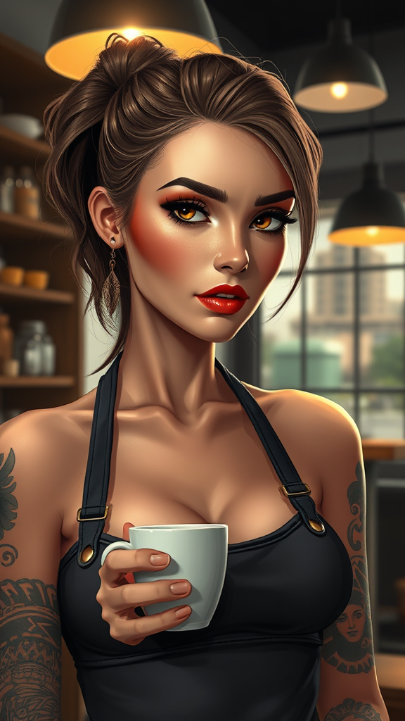Portrait of a stunning barista girl serving coffee, with a focus on her expressive eyes, adorned with mascara and makeup, and featuring prominent cheekbones. She stands in a cozy cafe with modern interior design, showcasing her tattoos and defined stomach muscles. The scene is captured in detailed lighting, employing techniques like rim lighting and chiaroscuro for dramatic effect. The style is a blend of professional majestic impressionism, reminiscent of Waterhouse, John Constable, and Atey Ghailan, with influences from Studio Ghibli, Jeremy Mann, Greg Manchess, and Antonio Moro. High detail and intricate artistry make this piece trending on ArtStation and CGSociety. The canvas is framed, integrating elements of cartoon and 3D with vibrant colors. Her image is seamlessly composed, avoiding odd proportions or anatomical inaccuracies, presenting a balanced and captivating portrait.
