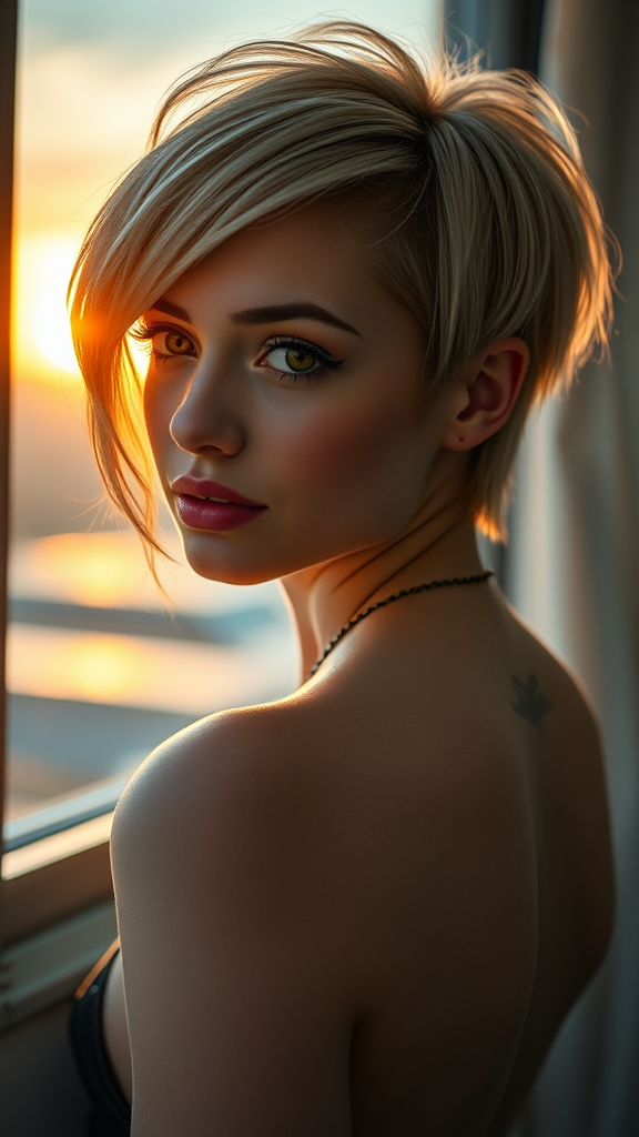 Portrait of a stunning girl with a chic asymmetric haircut, embodying a cyberpunk aesthetic, showcasing ethereal beauty, captured in 8k with a 50mm lens at f/1.4. The image features high detail and sharp focus, depicting a cowboy shot with perfect anatomy as she elegantly holds her arms behind her back. Sunlight gently illuminates her face during a picturesque sunset by the window, adding warmth to the scene.