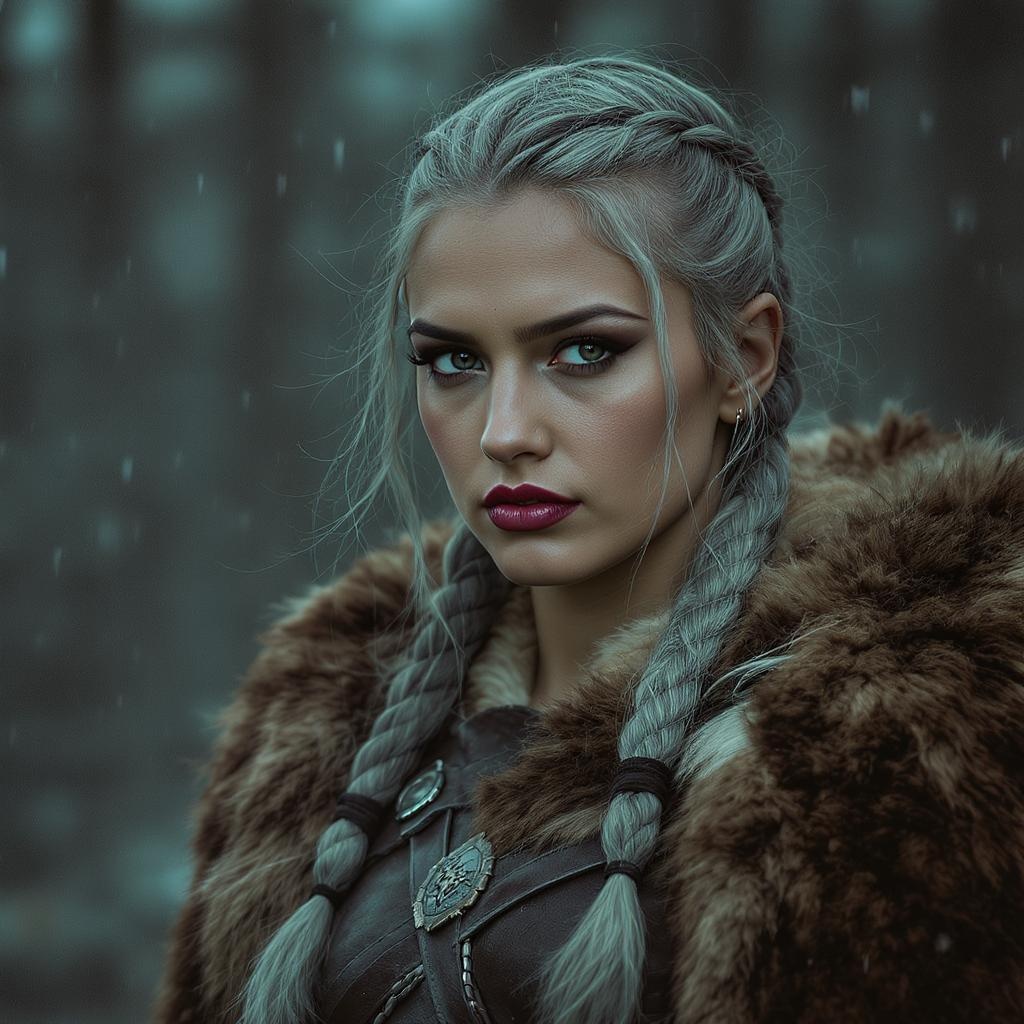 Portrait of a stunning modern female Viking in a detailed and realistic style, captured with the essence of portrait photography using an 85mm lens. The composition is intimate, with soft, natural lighting accented by dramatic effects, resulting in a magical, ultra-detailed portrayal. The image exhibits the atmosphere of Cinestill 800T film with its unique character. Despite being detailed and photo-realistic, there are creative imperfections such as JPEG artifacts and slightly disfigured anatomy, reminiscent of an abstract art piece, giving it a unique and slightly surreal charm. The color palette and lighting create a dreamy and evocative atmosphere, with subtle indications of signature markings or blurred textures that contribute to its distinctiveness.