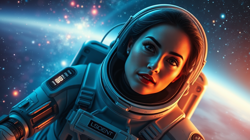 Portrait of a stunning woman in an advanced space suit gracefully drifting through the cosmos, ultra-detailed, photorealistic, dramatic lighting, cosmic backlighting, with a distant nebula casting vibrant colors, expressive eyes reflecting the stars, intricate suit design with illuminated accents, evoking a sense of tranquility and wonder.