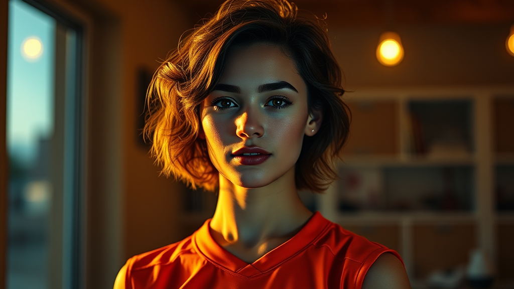 Portrait of a stunning young American woman with short wavy hair wearing a vibrant sports jersey, set indoors during the enchanting golden hour. The scene is bathed in dramatic, warm lighting, enhancing the photorealistic quality reminiscent of a Kodak Portra 800 photograph. Her confident expression and relaxed posture capture a moment of serene intensity, rendered in ultra-high-definition detail and a 9:16 aspect ratio, adding depth and a touch of artistic flair.