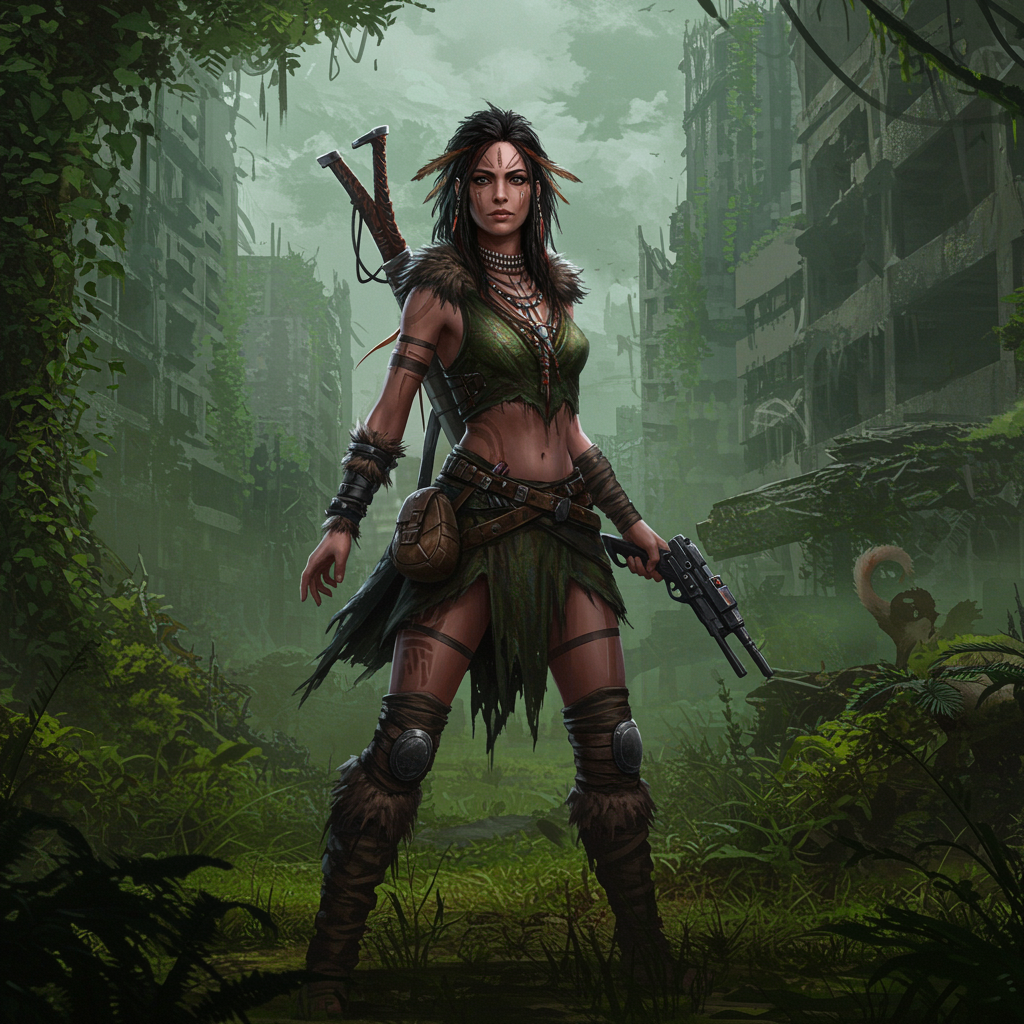 Portrait of a stunning young tribal woman in a desolate yet lush post-apocalyptic city, surrounded by vibrant greenery. The scene embodies a dark and gritty atmosphere with intricate details, showcasing volumetric lighting and a mysterious haze. The artwork reflects a fusion of styles reminiscent of Luis Royo and Greg Rutkowski, emphasizing concept art aesthetics and cover illustration quality. Rendered with a lifelike octane finish, the dynamic pose and rich textures create a captivating visual, evoking a sense of resilience and beauty amidst decay. Featuring a signature artistic flair, this 8k masterpiece remains consistent with trends seen on art platforms, capturing the harmony between nature and the remnants of civilization.