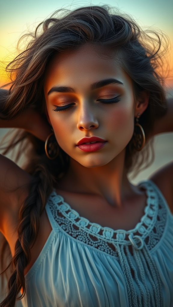 Portrait of a stunning young woman with an intricate and elegant appearance, showcasing a fantasy-inspired theme with detailed features. The scene is set with cinematic and gradient lighting that highlights her cute, fine face. She is posed with arms gently behind her back, exuding a serene and peaceful aura. Her eyes are closed as she enjoys the sunset on a tranquil beach. The composition is characterized by its best quality, masterpiece aesthetic in ultra high resolution, capturing the essence of a modern cowgirl spirit with a touch of whimsy.