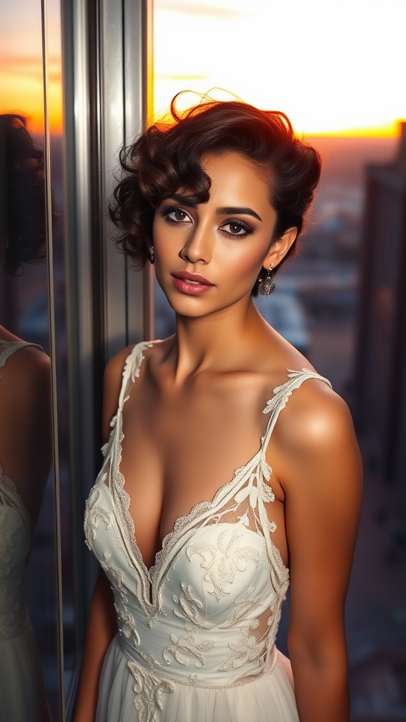 Portrait of a stylish and stunning young woman by a high-rise window, with short curly hair, wearing an elegant ivory evening gown with delicate lace detailing, captured with a 50mm lens at f/1.4, showcasing sharp focus and high detail. The photo features a cowboy shot composition with a gentle rim light illuminating her, set against a vibrant sunset backdrop, in 8K UHD, evoking a dreamlike and surreal atmosphere.