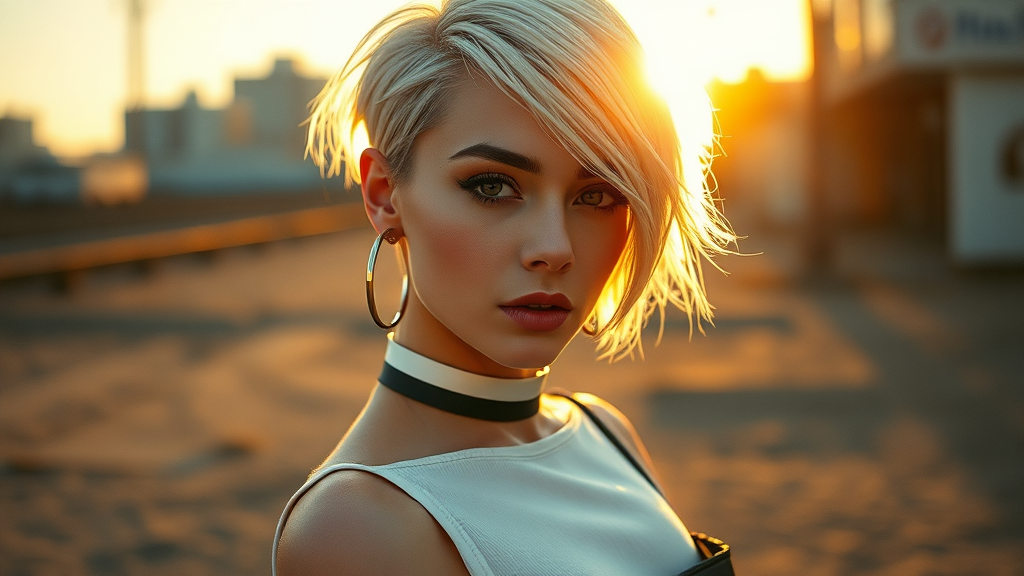 portrait of a stylish beautiful girl in a dystopian environment, with asymmetric haircut, cyberpunk aesthetic elements like hoop earrings and collar, wearing a white crop top and low-rise black leather pants. She exudes heavenly beauty captured in 8k with a 50mm lens at f/1.4 for high detail and sharp focus. The scene is toned with sunshine casting on her face during sunset, as she gazes directly at the camera. Her hair is white, adding to the futuristic feel, and a subtle watermark with artist name and internet address is included.