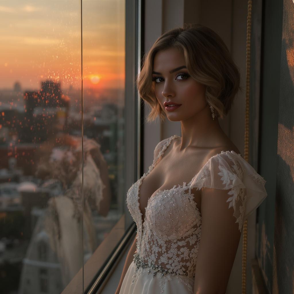 portrait of a stylish, stunning young woman posing beside a tall city window, her short, wavy hair framing her face elegantly. she wears an exquisite white evening gown adorned with intricate lace patterns. the setting sun casts a warm rim light on her, accentuating her features with a golden glow. captured with a 50mm lens at f/1.4, the image boasts high detail and sharp focus, presenting her from the waist up. the scene merges realism with a hint of dream-like quality, emphasizing the enchanting atmosphere of a sunset in 8K UHD.