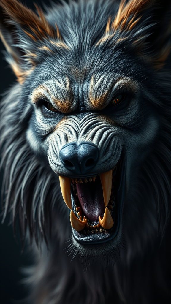 Portrait of a terrifying werewolf with menacingly detailed fangs and piercing, chilling eyes, cascading long fur, dramatic cinematic lighting, captivating volumetric lighting, dynamic composition, outstandingly perfect composition, striking photorealism, soft bokeh blur, intricately detailed character design, rendered with Unreal Engine and Octane, enhanced with HDR and subsurface scattering, captured with the precision of a Hasselblad H4D 200MS Digital Camera and the clarity of a Mitakon Speedmaster 65mm f/1.4 lens, featuring sophisticated Fresnel lighting to add depth and intensity.