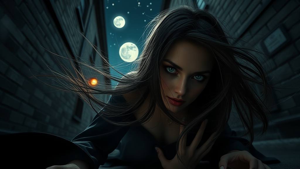 Portrait of a vampire woman with long, windy hair blowing dramatically in a Victorian back alley. She leans in, blood-sucking, with piercing jewel-like eyes locked onto the viewer. The perspective is from the ground, as if you are pinned down, capturing her crawling closer with a detailed symmetrical face under a moody night sky. Dust particles float in the air, highlighted by intricate rim lighting that adds depth to the dark alley scene. The dramatic lighting casts shadows across her features, enhancing the chilling nocturnal setting with a full moon and scattered stars. Her black dress flows as if part of the night itself, creating a mesmerizing contrast to the eerie atmosphere. The scene evokes styles of John Constable, Ed Blinkey, Atey Ghailan, with inspiration from artists like Jeremy Mann and Greg Manchess, known for trending high-detail art on platforms like ArtStation and CGSociety. Subtle influences of Makoto Shinkai's Kyoto work can be felt, creating a mix of vivid realism and gothic fantasy, maintaining the core essence while introducing a unique and captivating twist.